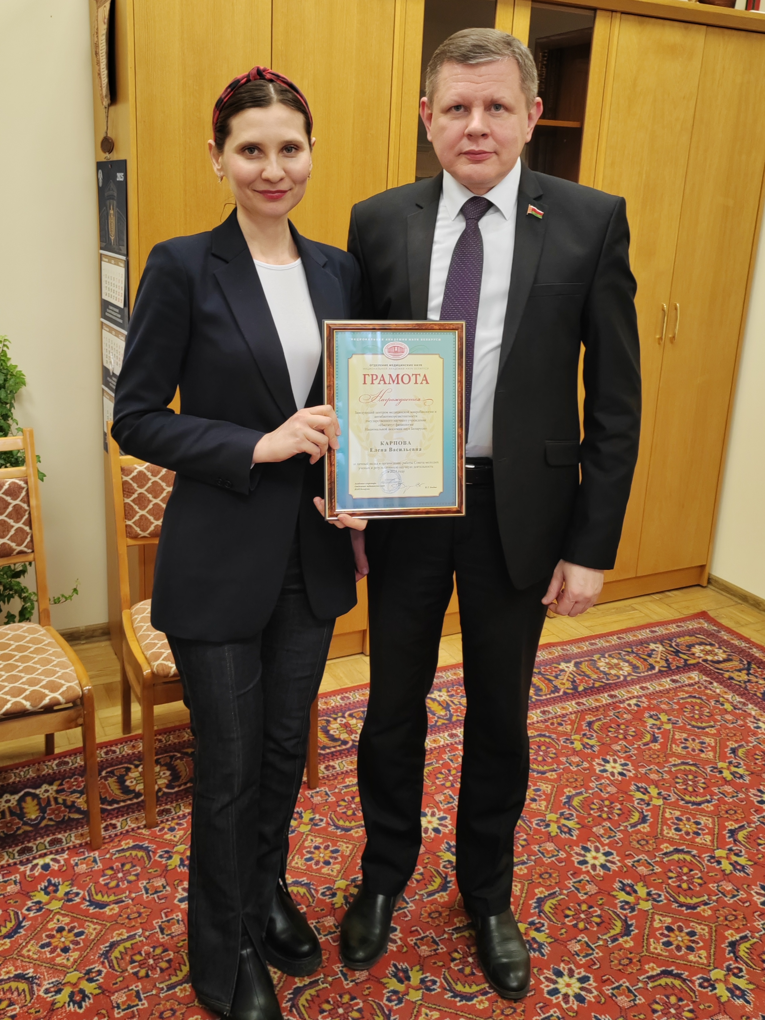 28 января на собрании Совета молодых ученых Отделения медицинских наук НАН Беларуси академик-секретарь, д.м.н.,профессор Богдан В.Г. вручил грамоту заведующему Центром медицинской микробиологии и антибиотикорезистентности, к.м.н., доценту Карповой Е.В. за личный вклад в организацию работы Совета молодых учёных и результативную научную деятельность в 2025 году.