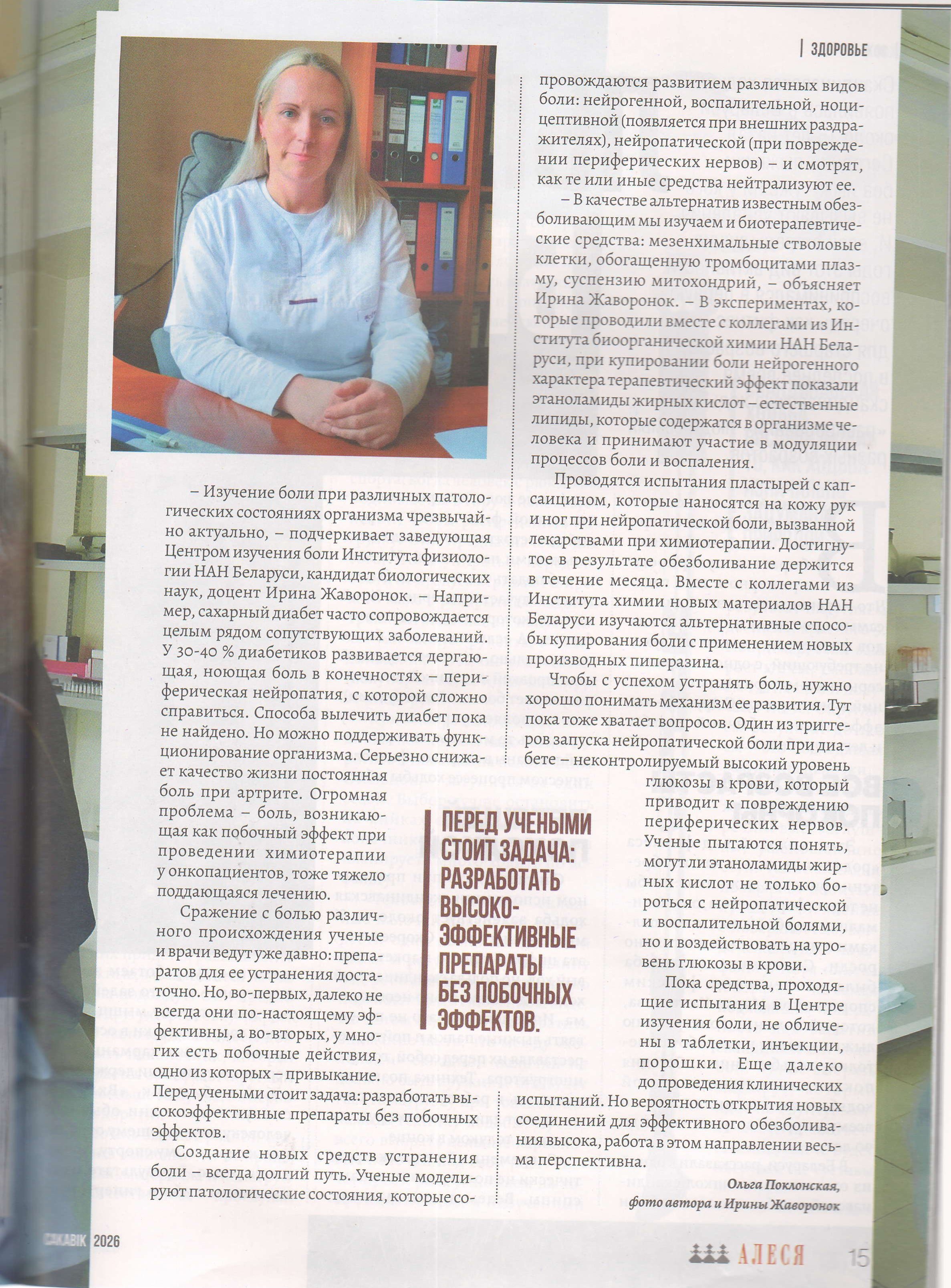 📗В журнале «Алеся» (номер 3, 2026 г.) опубликовано интервью заведующего Центром изучения боли, к.б.н., доцента Жаворонок И. П. «Поединок с болью». 30. 03. 2026